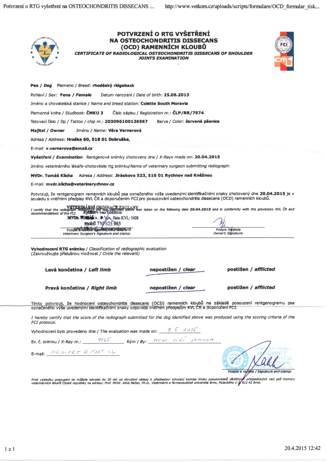 Potvrzení o RTG vyšetření (OCD) ramenních kloubů