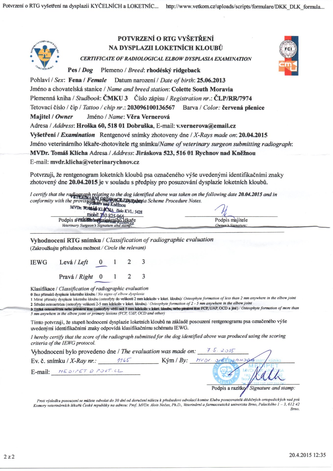 Potvrzení o RTG vyšetření na dysplazii loketních kloubů