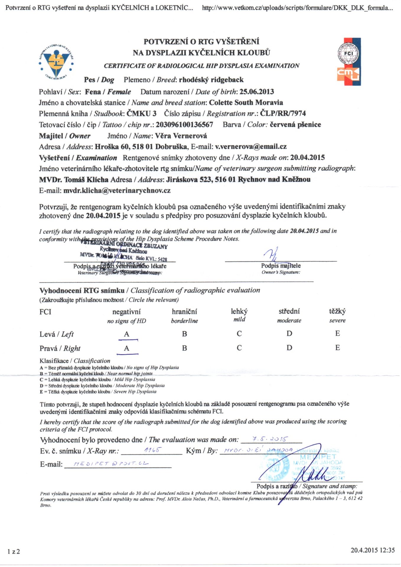 Potvrzení o RTG vyšetření na dysplazii kyčelních kloubů