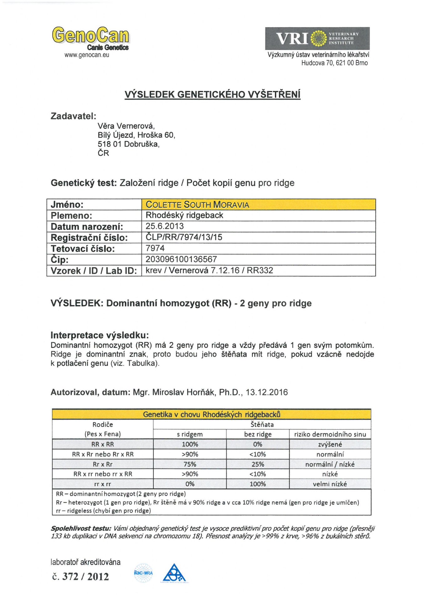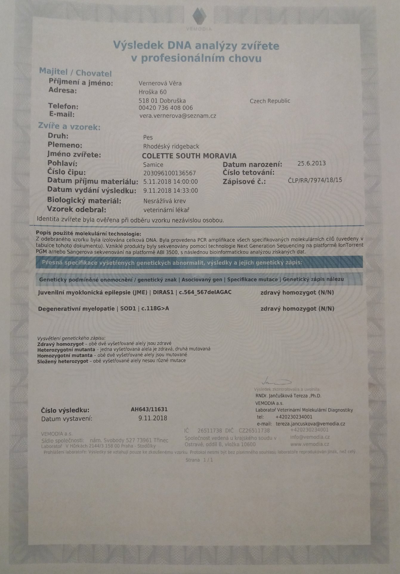 Potvrzení o genetickém vyšetření - degenerativní myelopatie (DM)